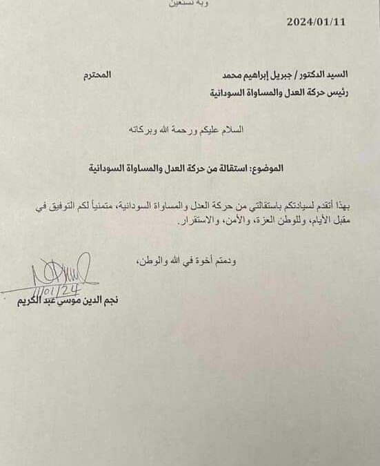 قدم القيادي بحركة العدل والمساواة السودانية نجم الدين موسي عبدالكريم استقالته من الحركة ، اليوم السبت.