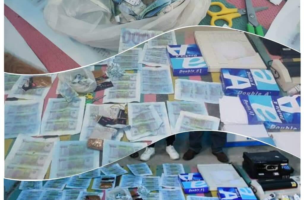 حيث وقف الفريق على مسرح الحادث ومن خلال البحث تم ضبط مكنة طباعة ملونة وكمية من من الأحبار وبكت وادوات تقطيع العملة.تم القبض علي عدد اربعه متهمين ومن بينهم الشاكي.