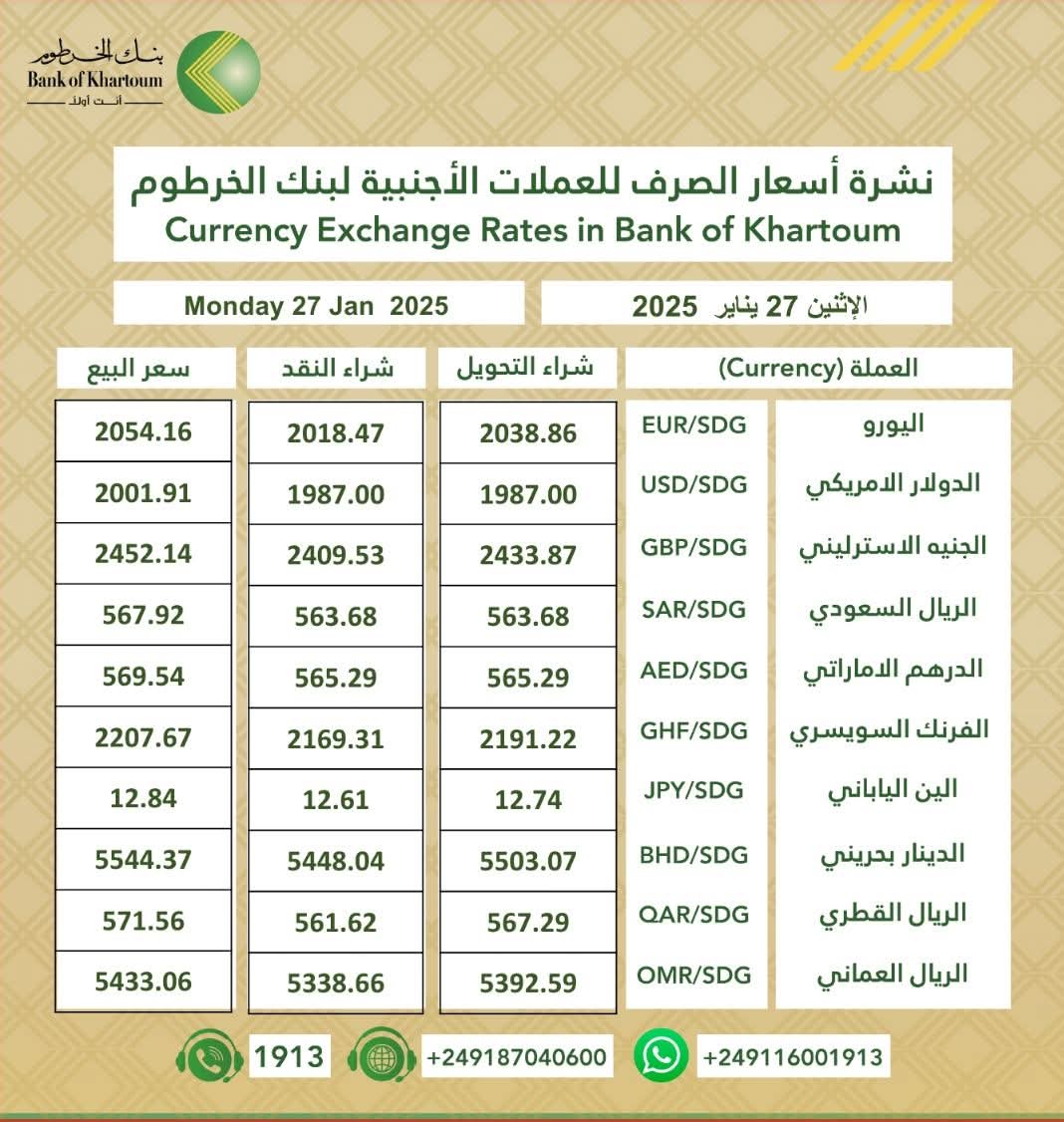 أسعار العملات الصادرة من بنك الخرطوم اليوم الإثنين 27 يناير 2025م