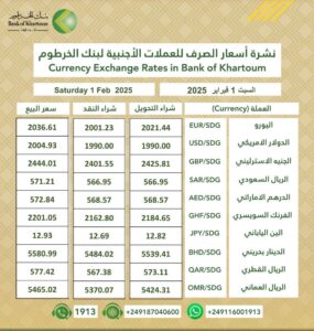 أسعار العملات الصادرة من بنك الخرطوم  اليوم  السبت  1 فبراير  2025م