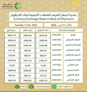 أسعار العملات الصادرة من بنك الخرطوم اليوم الثلاثاء 11 فبراير 2025م