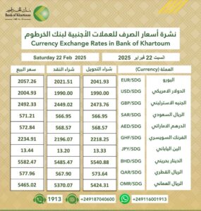 أسعار العملات الصادرة من بنك الخرطوم اليوم السبت 22 فبراير 2025م