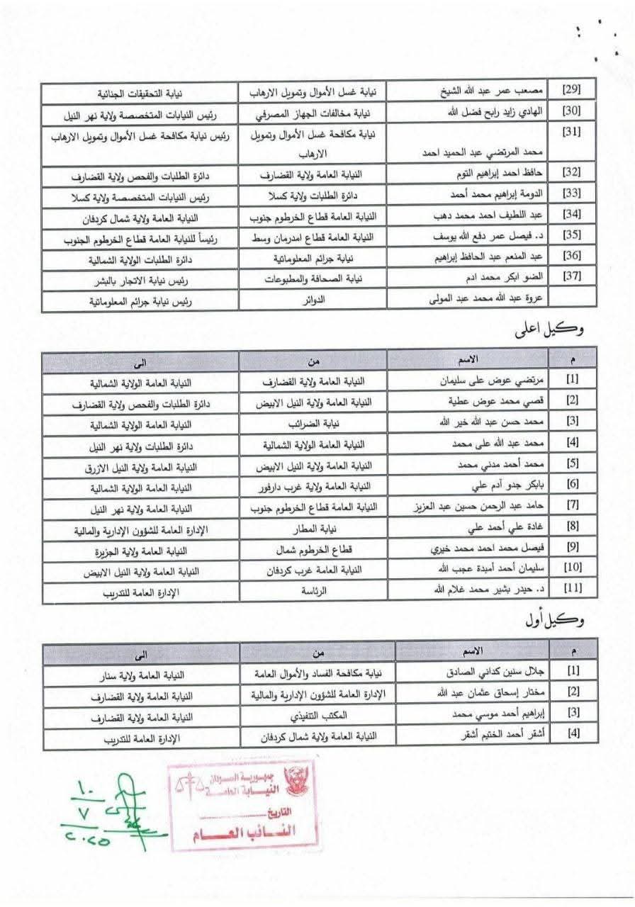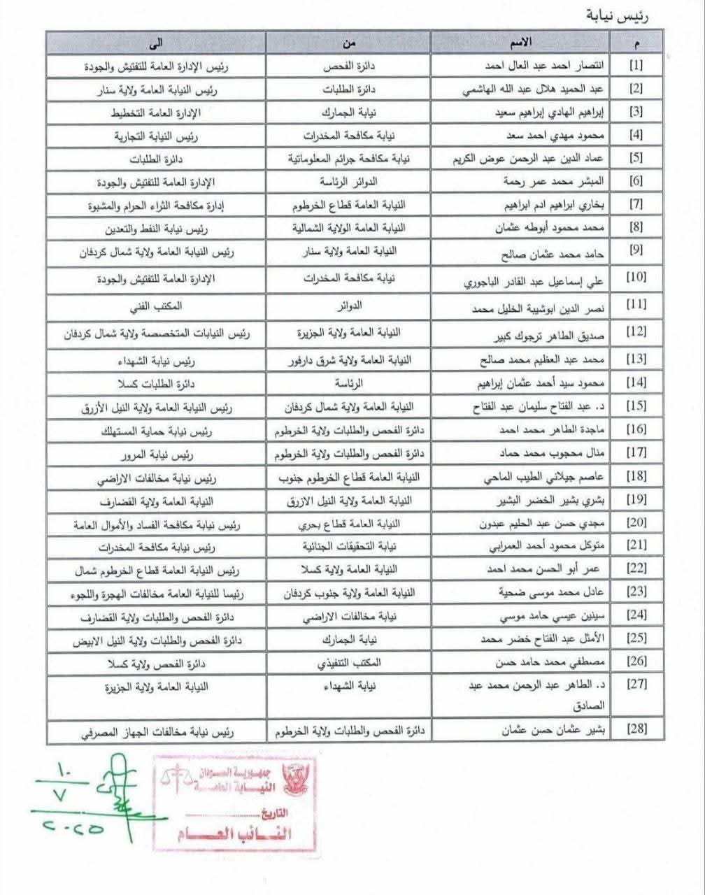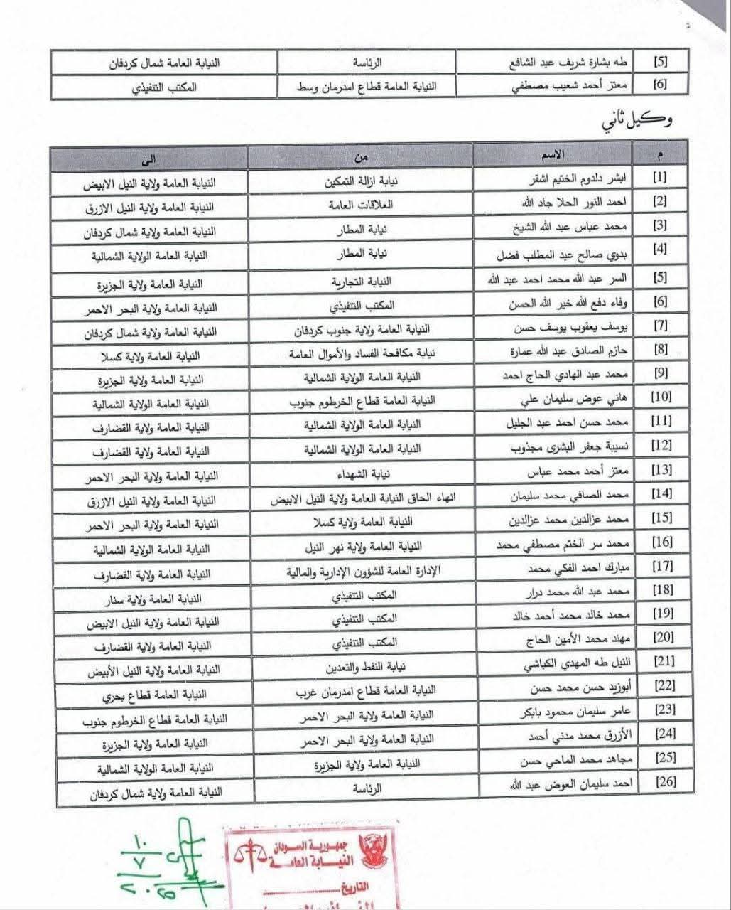 تحصلت منصة الراي السوداني على تفاصيل قرار أصدره النائب العام، مولانا الفاتح طيفور، قضى بإجراء حركة تنقلات واسعة وسط وكلاء النيابة العامة.