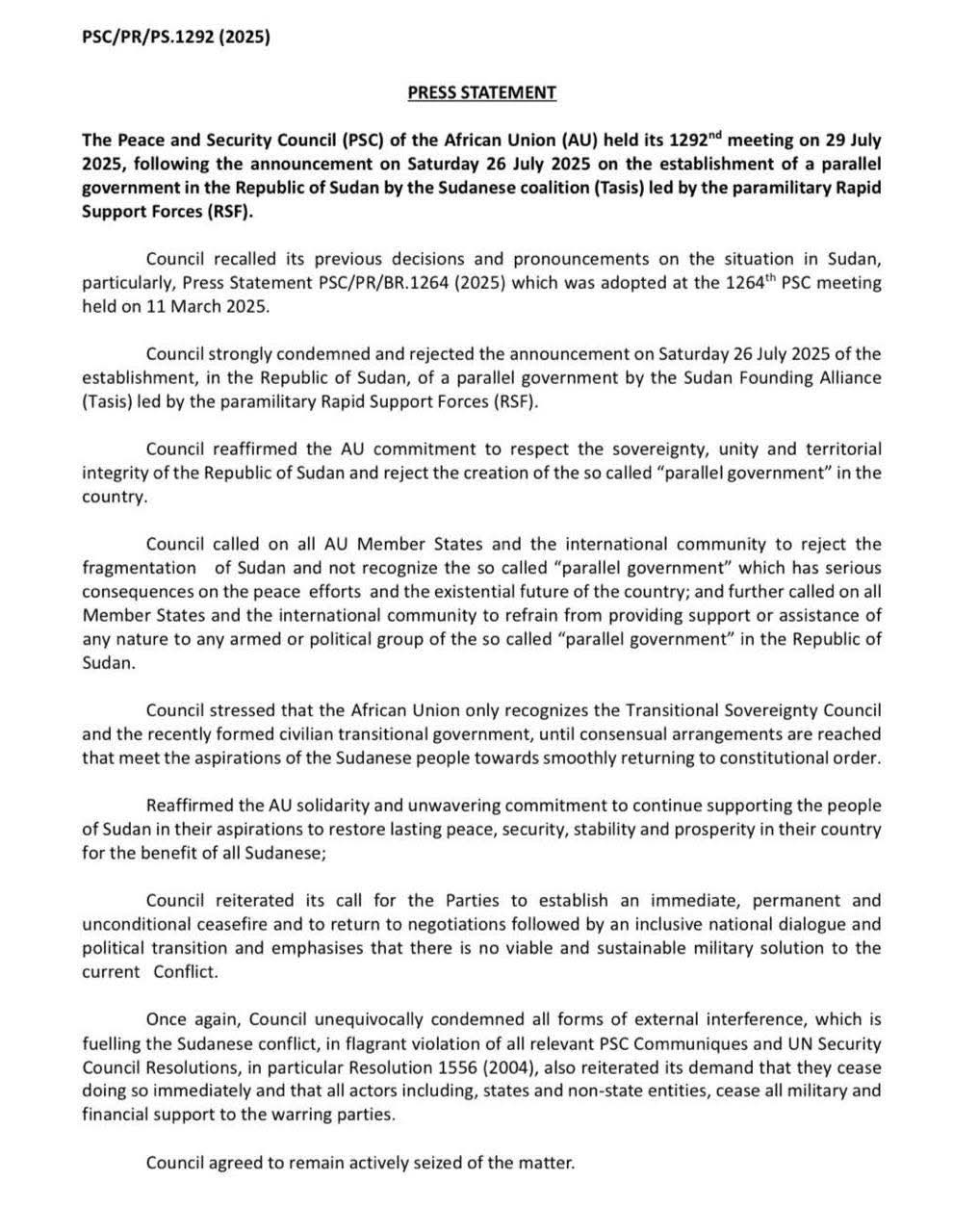وجدد المجلس في بيانه الرسمي الثلاثاء اعتراف الاتحاد الإفريقي الحصري بـ مجلس السيادة الانتقالي والحكومة المدنية الانتقالية التي تم تشكيلها مؤخرًا، باعتبارهما السلطتين الشرعيتين في البلاد، داعيًا كافة الدول الأعضاء في الاتحاد والمجتمع الدولي إلى رفض التعامل مع الحكومة الموازية أو تقديم أي دعم سياسي أو مادي لها.