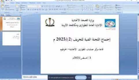 رئيس اللجنة، خالد الجمري، أوضح أن الاجتماع ناقش التطورات الميدانية ومستوى الاستعدادات في الولايات، مشيرًا إلى تكليف من وكيل وزارة الصحة الدكتور هيثم محمد إبراهيم بإعداد تقرير شامل عن الوضع الراهن، يوضح حجم الاحتياجات والفجوات، تمهيدًا لعرضه في اجتماع المجلس الأعلى للدفاع المدني المرتقب.
