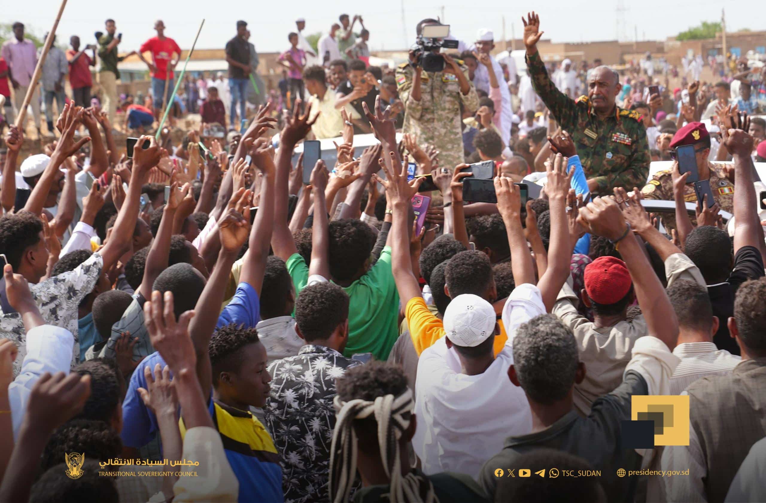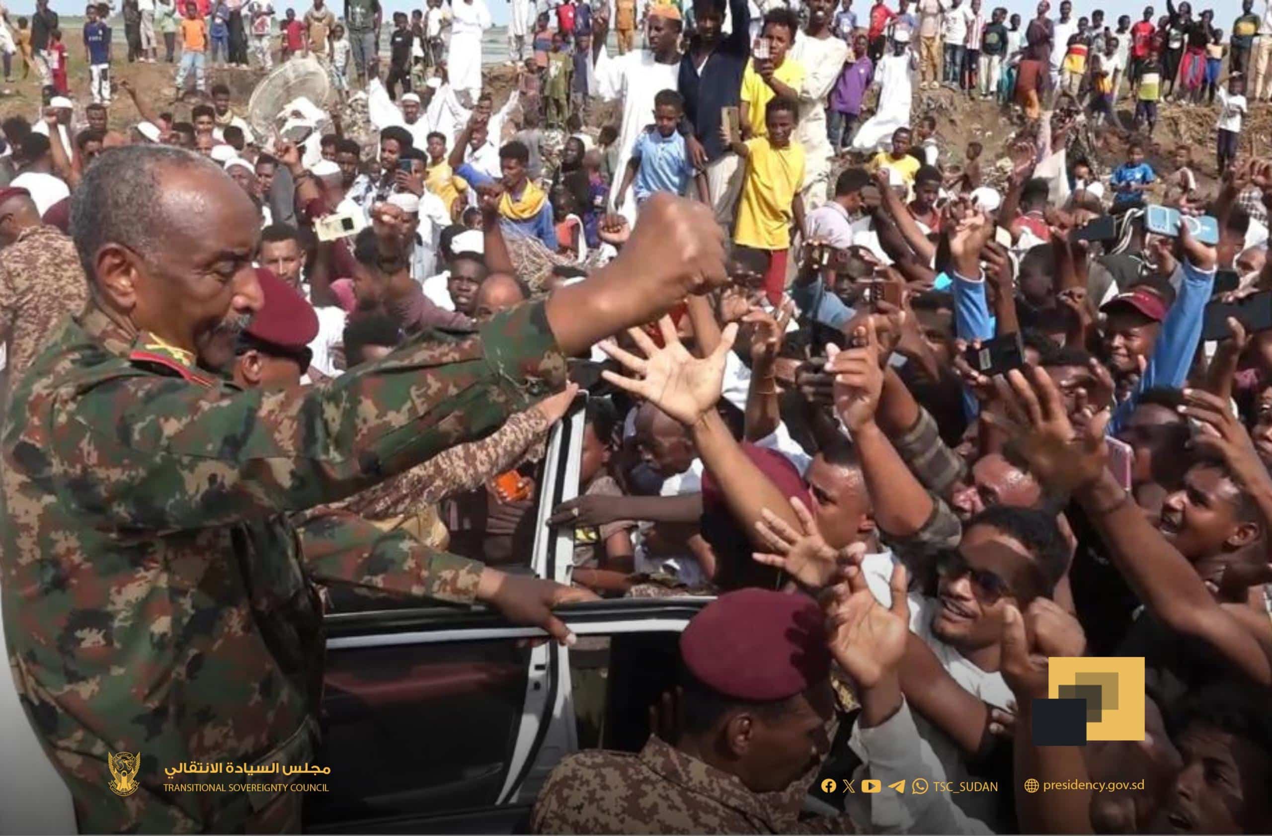 واستقبل آلاف المواطنين موكب رئيس مجلس السيادة بهتافات مدوية: