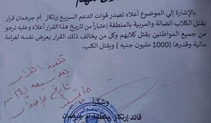 أصدرت قوات الدعم السريع في منطقة أم جرهم بولاية شمال دارفور قرارًا مثيرًا للجدل يقضي بقتل جميع الكلاب في المنطقة، مملوكة كانت أو ضالة، مع فرض غرامة مالية قدرها مليون جنيه سوداني على من يرفض التنفيذ.