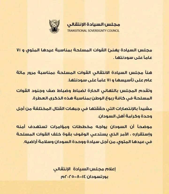 وأضاف المجلس أن ذكرى المئوية ليست مجرد احتفال، بل عهد جديد بالمضي في طريق العزة والسيادة، حتى يبقى السودان موحداً وآمناً على مر الأجيال.