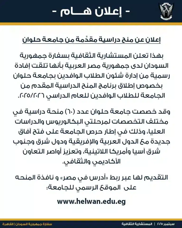 في خطوة أكاديمية مفاجئة، أفادت مصادر مطلعة أن جامعة حلوان المصرية قررت فتح باب التقديم أمام الطلاب السودانيين للحصول على 60 منحة دراسية كاملة لمرحلتي البكالوريوس والدراسات العليا، ضمن برنامجها الدولي للعام الأكاديمي 2025 – 2026.