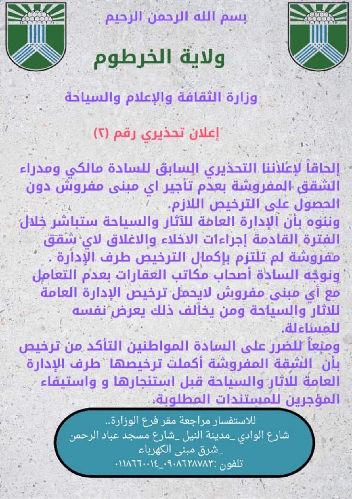 التحذير شمل كذلك مكاتب العقارات التي تتعامل مع شقق غير مرخصة، حيث أُبلغوا بشكل مباشر بضرورة الامتناع عن التوسط أو الإعلان عن أي مبنى مفروش غير حاصل على إذن رسمي من الإدارة العامة للآثار والسياحة في السودان.