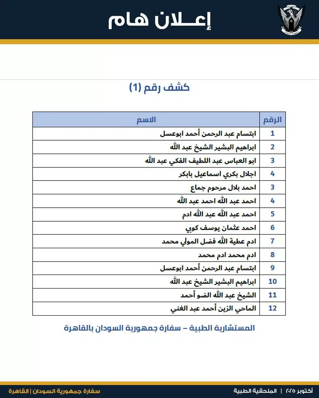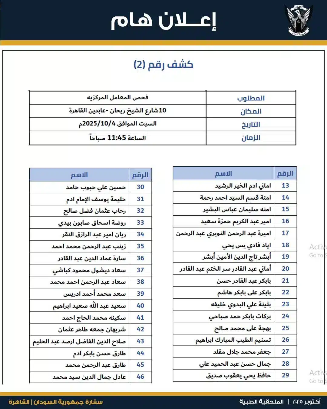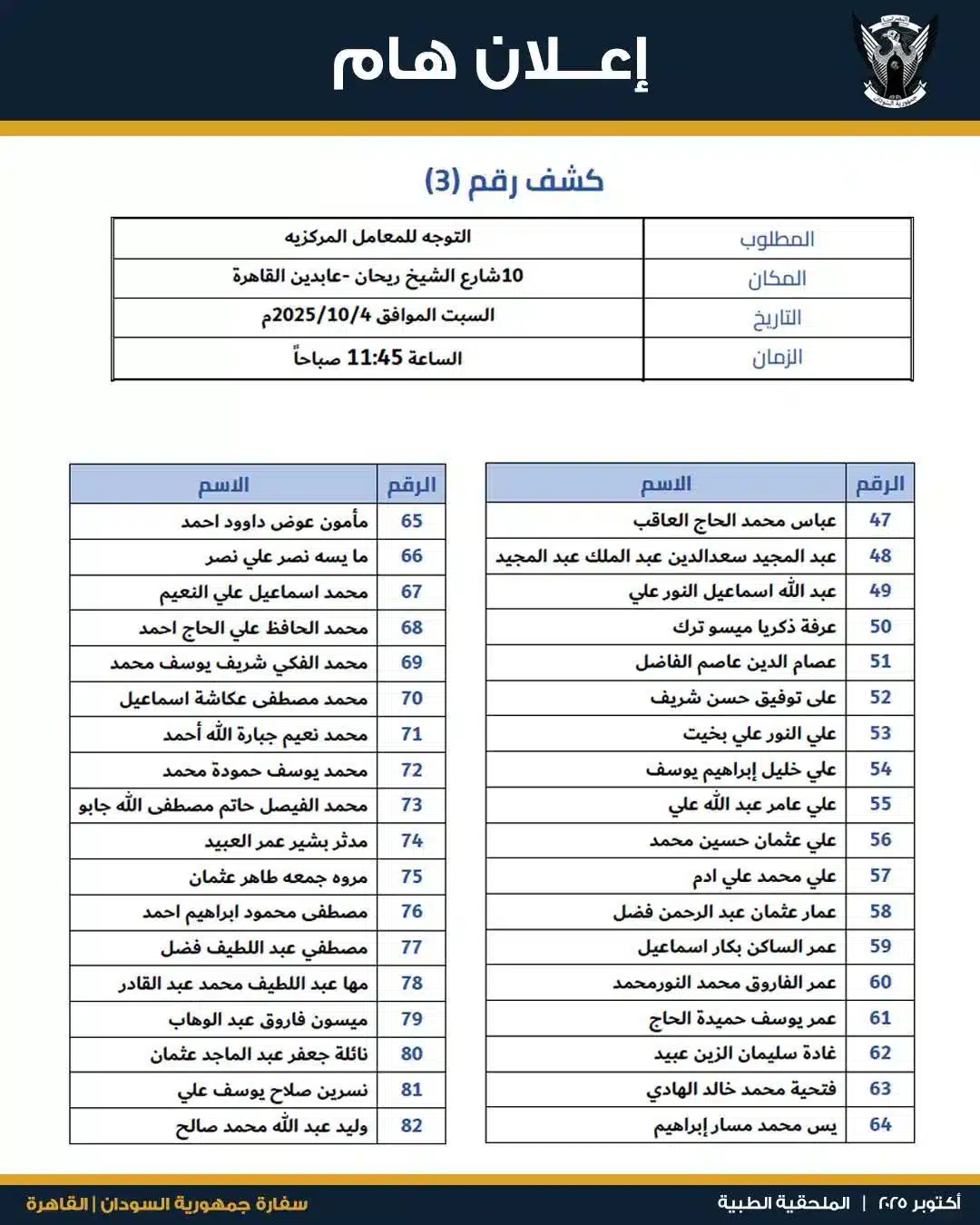أفادت مصادر مطلعة بأن السفارة السودانية في القاهرة أصدرت توجيهًا رسميًا لمجموعة محددة من المواطنين السودانيين، بضرورة الحضور في موعد دقيق إلى المعامل المركزية بمنطقة عابدين، صباح السبت 4 أكتوبر 2025، وذلك لاستكمال إجراءات ورقية حيوية تتعلق بفحوصات طبية معتمدة.