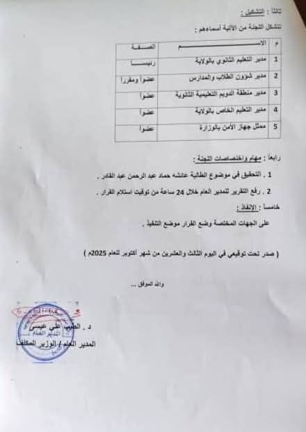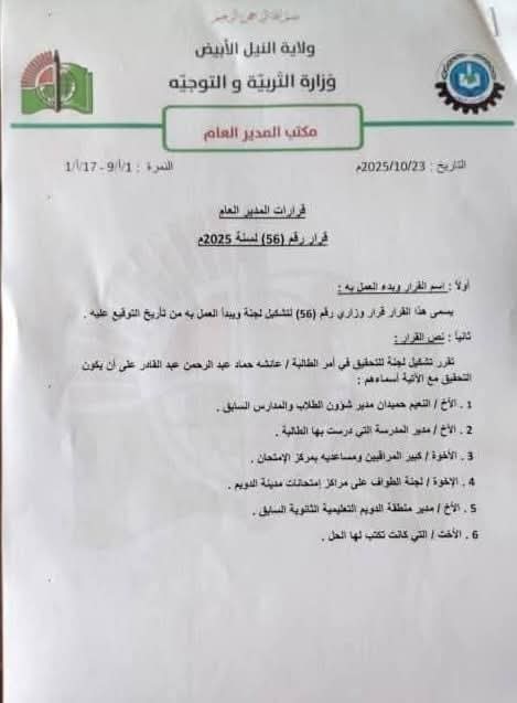 وقد أصدر الدكتور النذير الطاهر إبراهيم محمد، المدير العام للوزارة، قرارًا بتشكيل اللجنة التي ستتولى التحقيق في ملابسات القضية، حيث يرأسها مدير التعليم الثانوي بالوزارة وتضم في عضويتها ممثلين من جهاز الأمن الداخلي. اللجنة مكلفة بإعداد تقريرها خلال 24 ساعة من تاريخ القرار.