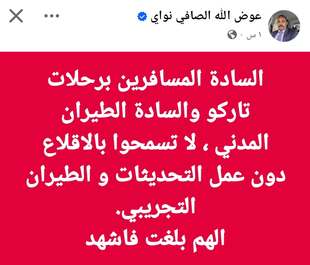 أطلق عوض الله الصافي نواي تحذيرًا علنيًا عبر صفحته الرسمية على فيسبوك دعا فيه المسافرين على متن رحلات شركة تاركو وسلطات الطيران المدني إلى عدم السماح بإقلاع أي طائرة قبل إجراء التحديثات الفنية والطيران التجريبي، في ظل التطورات الطارئة المتعلقة بطائرات إيرباص من طراز A320.