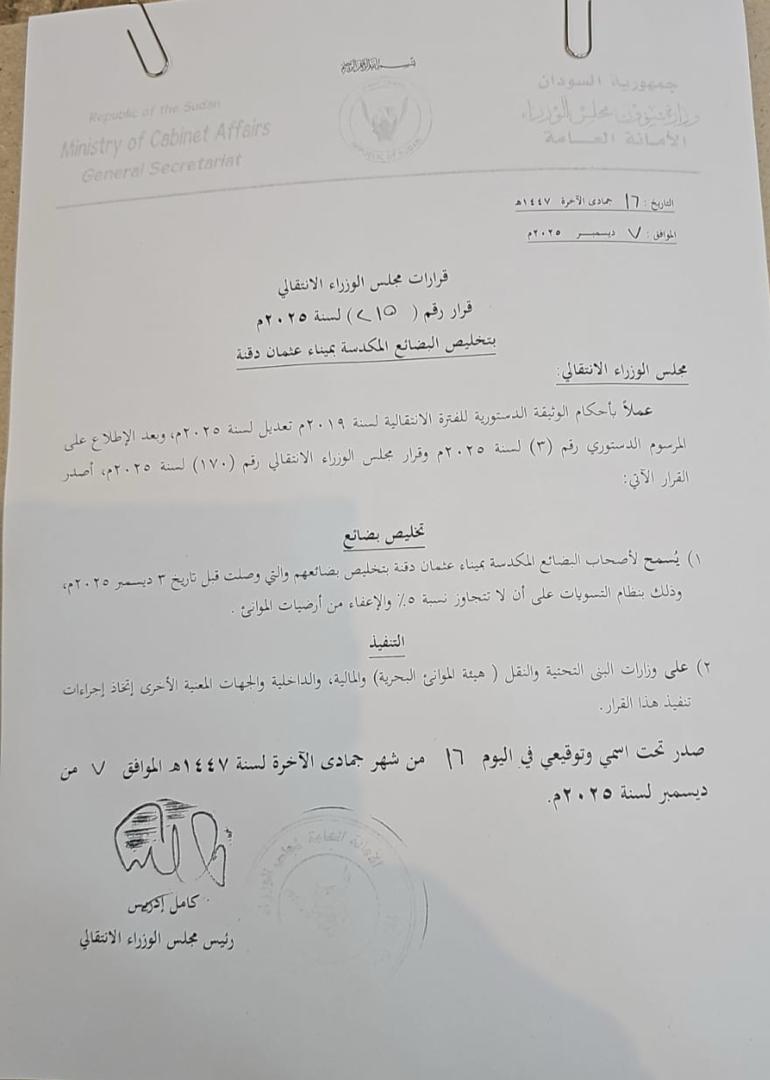 وبحسب معلومات حصلت عليها” الراي السوداني”، فإن مكتب هيئة الموانئ بميناء عثمان دقنة امتنع عن تطبيق القرار رغم صدوره رسميًا، الأمر الذي أثار استياءً واسعًا وسط مجتمع الأعمال، خاصة في ظل الأوضاع الاقتصادية الحساسة التي تمر بها البلاد.