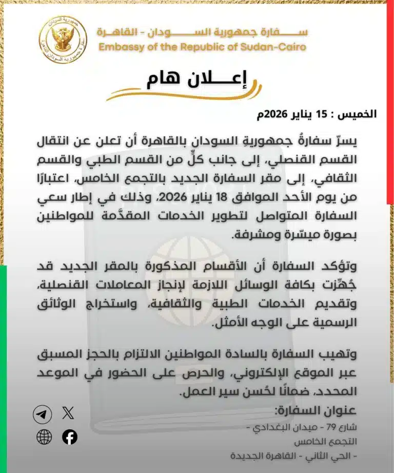 ووفق معلومات حصل عليها” الراي السوداني”، فإن مكاتب القسم القنصلي، والقسم الطبي، والقسم الثقافي ستباشر أعمالها من المقر الجديد للسفارة بمنطقة التجمع الخامس، ضمن خطة شاملة لإعادة هيكلة الخدمات وتخفيف الضغط الإداري وتحسين تجربة المراجعين.
