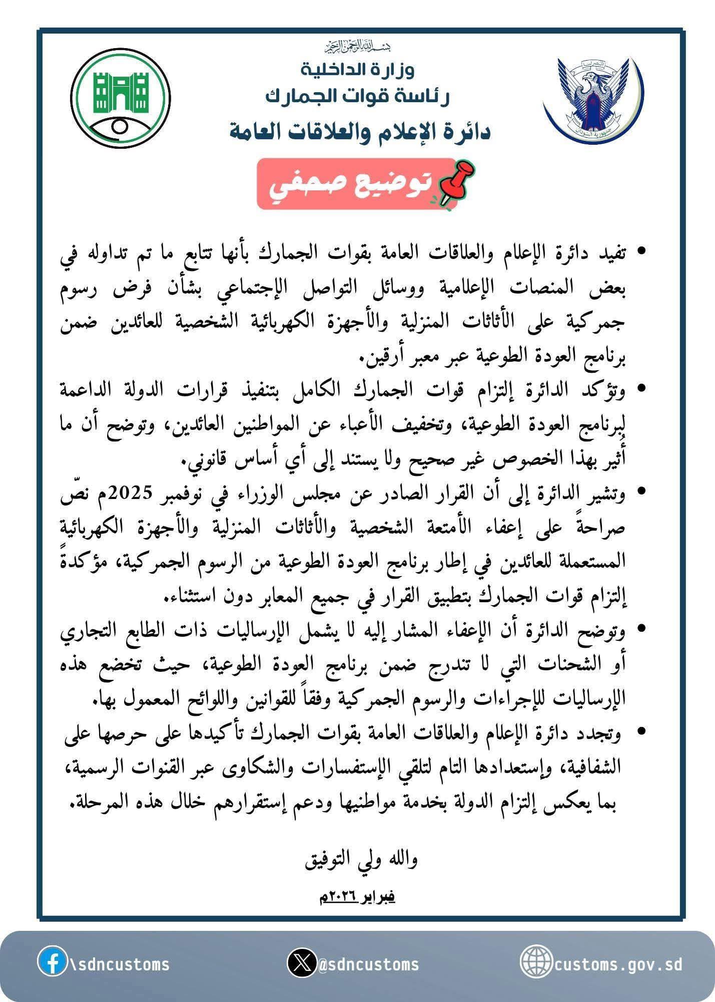 وفي هذا السياق، شددت الجهات المختصة على وجود تمييز واضح بين الأمتعة الشخصية للعائدين، وبين الإرساليات ذات الطابع التجاري أو الشحنات التي لا تندرج ضمن برنامج العودة الطوعية، حيث تخضع الأخيرة للإجراءات والرسوم الجمركية المعمول بها وفق القوانين السارية.
