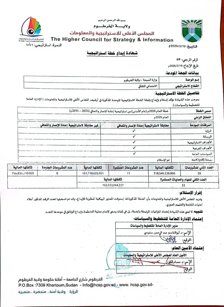 أودعت وزارة الصحة بولاية الخرطوم خطتها الاستراتيجية للأعوام (2026–2030) مصحوبة بالخطة التشغيلية، لدى المجلس الأعلى للتخطيط الاستراتيجي، في خطوة تستهدف إعادة بناء النظام الصحي واستعادة الخدمات بعد الأضرار الواسعة التي لحقت بالقطاع خلال فترة الحرب.