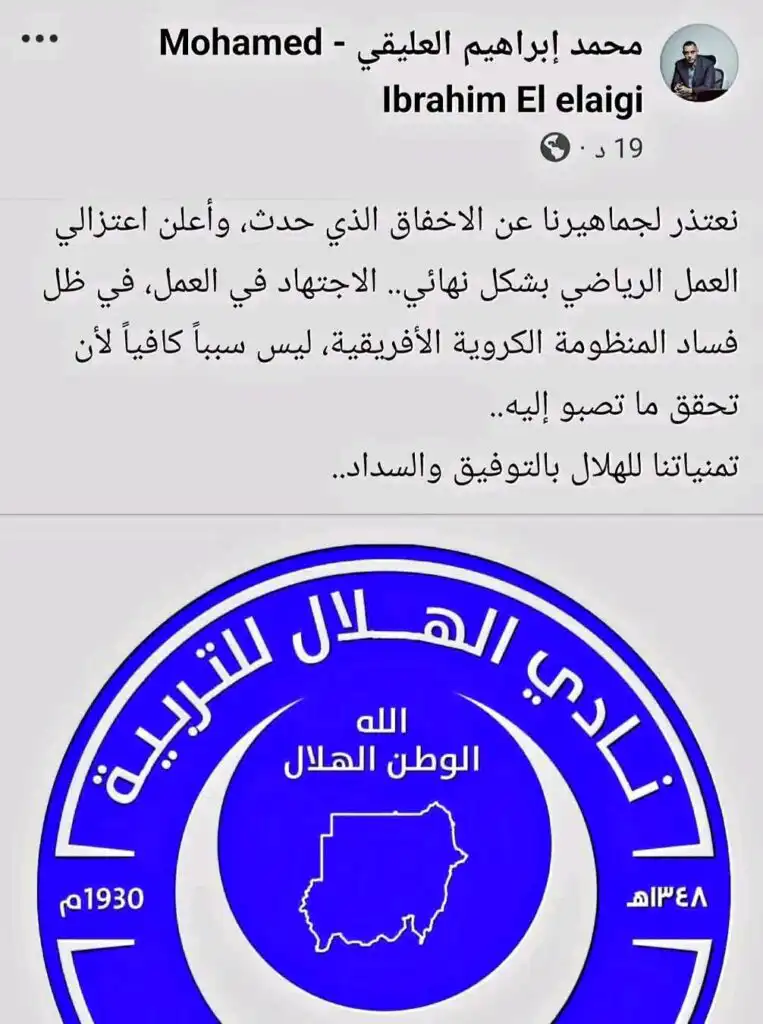 أعلن نائب رئيس نادي الهلال السوداني محمد إبراهيم العليقي اعتزاله العمل الرياضي نهائياً، وذلك عقب خروج الفريق من الدور ربع النهائي لبطولة دوري أبطال أفريقيا أمام نهضة بركان المغربي.