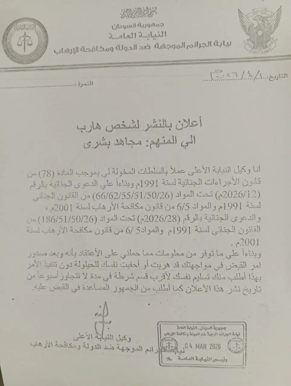 طالبت نيابة الجرائم الموجّهة ضد الدولة ومكافحة الإرهاب، في إعلان رسمي صدر بتاريخ 4 مارس 2026، المتهم مجاهد بشري بتسليم نفسه خلال مهلة لا تتجاوز أسبوعاً من تاريخ نشر الإعلان.