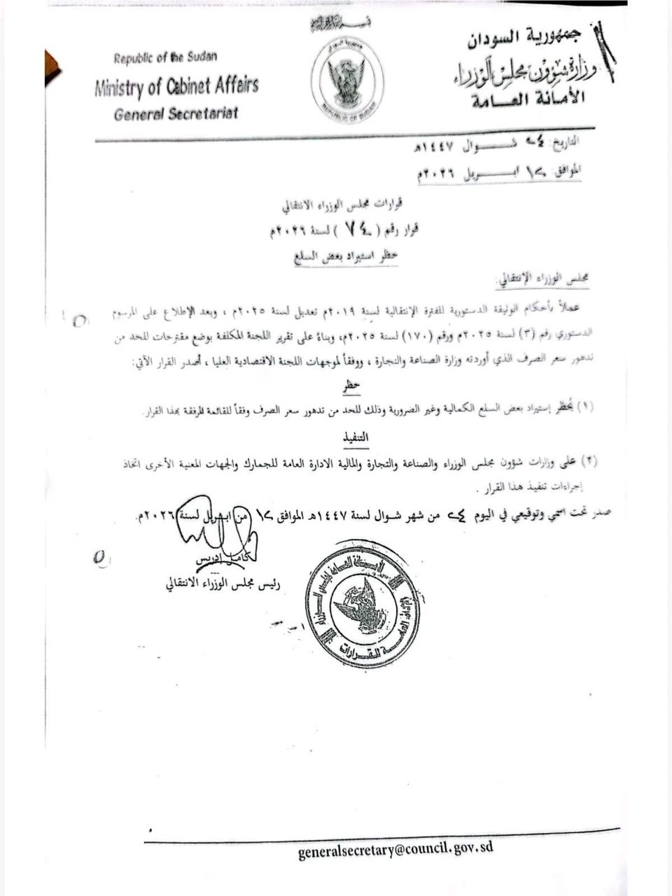 واستند القرار إلى أحكام الوثيقة الدستورية للفترة الانتقالية وتعديلاتها لعام 2025، وجاء بناءً على توصيات لجنة فنية شكلتها وزارة الصناعة والتجارة لوضع معالجات عاجلة للحد من التدهور الاقتصادي والحفاظ على قيمة الجنيه السوداني أمام العملات الأجنبية.