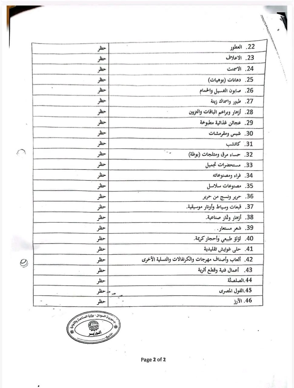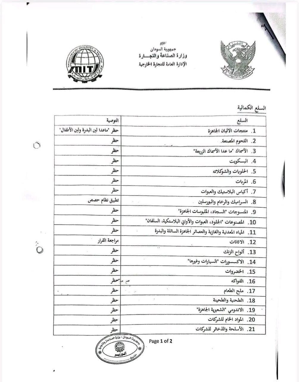 وشملت قائمة السلع المحظورة مجموعة واسعة من المنتجات الغذائية والمواد الاستهلاكية، من بينها منتجات الألبان الجاهزة – باستثناء لبن البدرة وألبان الأطفال – إلى جانب اللحوم المصنعة، الأسماك، البسكويت، والحلويات، فضلاً عن مواد البناء والمنسوجات والمنتجات الجلدية والبلاستيكية.